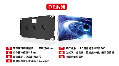 銳尚系列顯示屏每塊模組均擁有獨立主控芯片,能夠自動讀取和記錄模組的工作數據,同時具有錯誤偵測和定位等功能。小間距DE系列顯示屏設計輕薄,有效減少屏體安裝空間。