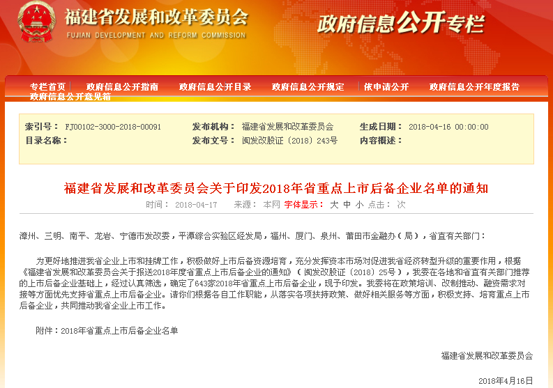 2018年4月16日,福建省發(fā)展改革委員會(huì)官網(wǎng)發(fā)布了《福建省發(fā)展和改革委員會(huì)關(guān)于印發(fā)2018年省重點(diǎn)上市后備企業(yè)名單的通知》,確定了福日電子參股企業(yè)福建福順微電子有限公司等643家2018年福建省重點(diǎn)上市后備企業(yè)。福建省發(fā)展改革委員會(huì)將在政策培訓(xùn)、改制推動(dòng)、融資需求對接等方面優(yōu)先支持省重點(diǎn)上市后備企業(yè),并要求各地市根據(jù)各自工作職能,從落實(shí)各項(xiàng)扶持政策、做好相關(guān)服務(wù)等方面,積極支持、培育重點(diǎn)上市后備企業(yè),共同推動(dòng)福建省企業(yè)上市工作。
