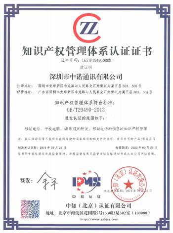 2019年9月,福日電子成員企業深圳市中諾通訊有限公司、廣東以諾通訊有限公司先后通過知識產權管理體系認證,進一步推進公司知識產權管理工作規范化、系統化、科學化,提升企業核心競爭力。