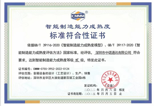 2021年9月-10月,由電子標(biāo)準(zhǔn)院授權(quán)江蘇赫瑪信息科技有限公司組建團(tuán)隊(duì),基于GB/T 39116-2020《智能制造能力成熟度模型》、GB/T 39117-2020《智能制造能力成熟度評(píng)估方法》國家標(biāo)準(zhǔn),對(duì)中諾通訊新百麗工業(yè)園從工廠設(shè)計(jì)、產(chǎn)品研發(fā)、工藝設(shè)計(jì)、計(jì)劃與調(diào)度、生產(chǎn)作業(yè)、倉儲(chǔ)配送、質(zhì)量管控、設(shè)備管理、安全管控、能源管理、環(huán)保管理等20個(gè)能力子域的智能制造能力成熟度,通過人員交流、現(xiàn)場巡視、系統(tǒng)查看等方法進(jìn)行評(píng)估,認(rèn)定該公司智能制造能力成熟度達(dá)到貳級(jí)水平,得到國家認(rèn)可。
